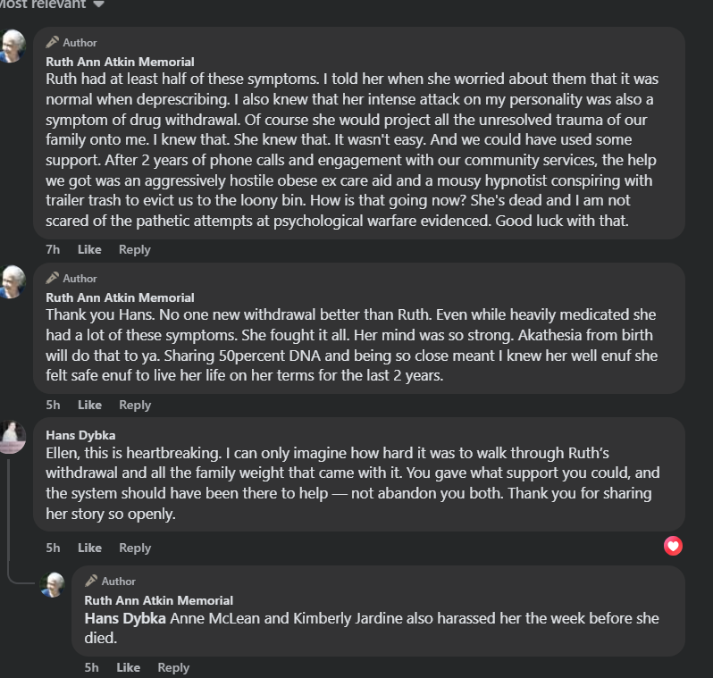 I called out the liars. I shamed the crown. I shamed the system. Ruth and my mother were set up to take the blame for sins of the damned. They weren’t. They aren’t. I see them on the other side. I saw my dad the other morn. He’s been dead since 2006. The torture my parents endured is a testament to their strength not their weakness.